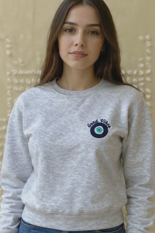 Soft and cozy Grey sweatshirt with “Good Vibes” embroidery on left chest
